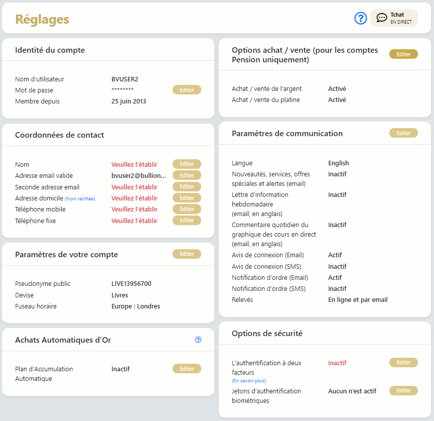 Cette page vous explique comment définir les coordonnées et régler certaines options de votre compte Golden Window (votre identité, vos coordonnées, votre fuseau horaire, votre alarme antivol etc.)